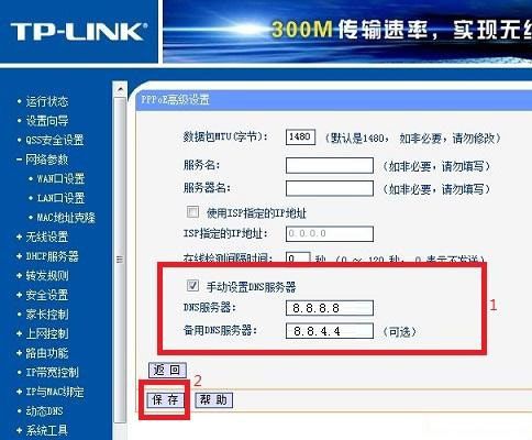 最后,我们只需要勾选上“手动设置DNS服务器”,然后填写DNS服务器为8.8.8.8,备用DNS服务器为8.8.4.4,完成后点击底部的保存按钮即可[如图]。